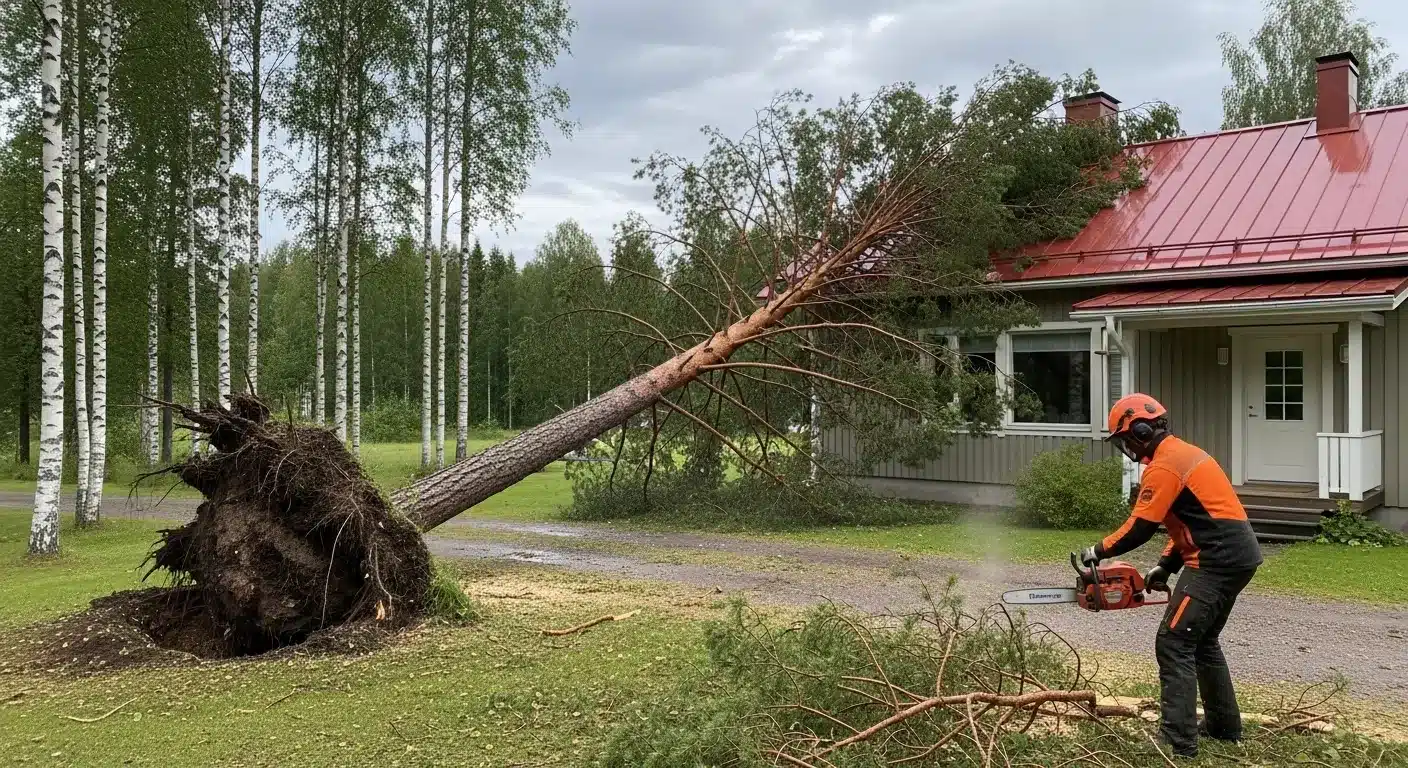 Jos puu on suuri, osittain kaatunut, juuriltaan irronnut tai jäänyt roikkumaan rakennuksen päälle, älä koskaan yritä poistaa sitä itse. Ammattilaisella on käytössä nostokalusto, turvavarusteet ja kokemus arvioida riskit tapauskohtaisesti oikein.